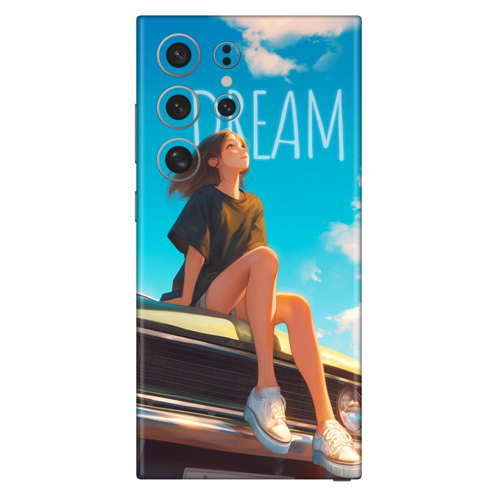 Transform your mobile device into a piece of art with the GADGETS DECOR Dreamy Anime Girl Aesthetic Phone Skin. This unique design captures a serene moment with an anime girl sitting atop a classic car, looking towards a vibrant, cloudy sky and the word “DREAM” in a neon glow.