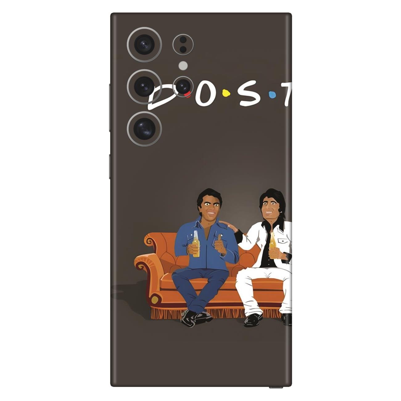 Flaunt your love for the iconic Bollywood classic, and the universal theme of friendship with this unique Sholay Dost Vibe Mobile Skin. Featuring a vibrant cartoon illustration of the legendary Jai and Veeru sitting on a couch, paired with a creative take on the Friends TV show logo, this skin is perfect for any Bollywood enthusiast looking to add a touch of nostalgia and style to their phone.